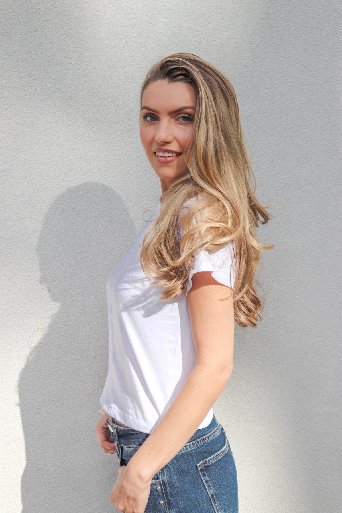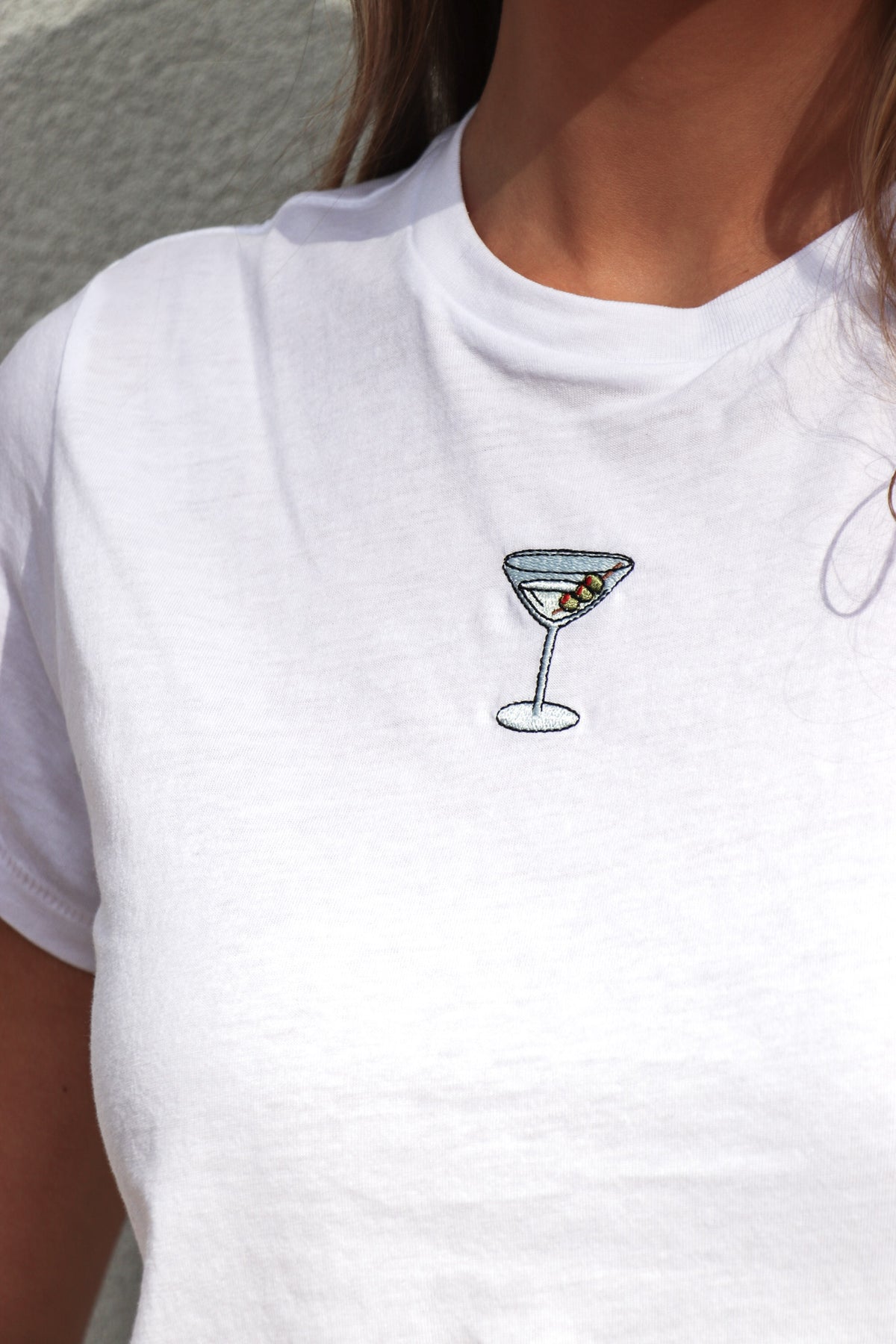 A little martini never hurt anybody, meet your new favorite tee with attitude. Cheers to effortless style. This classic white tee gets a playful upgrade with a tiny martini glass embroidery that adds just the right dose of personality. Pair it with vintage wash denim, an oversized blazer, and silver hoops for an easy off duty vibe that still feel intentional. Tuck it into a sleek midi skirt for a chic twist on elevated dressing,