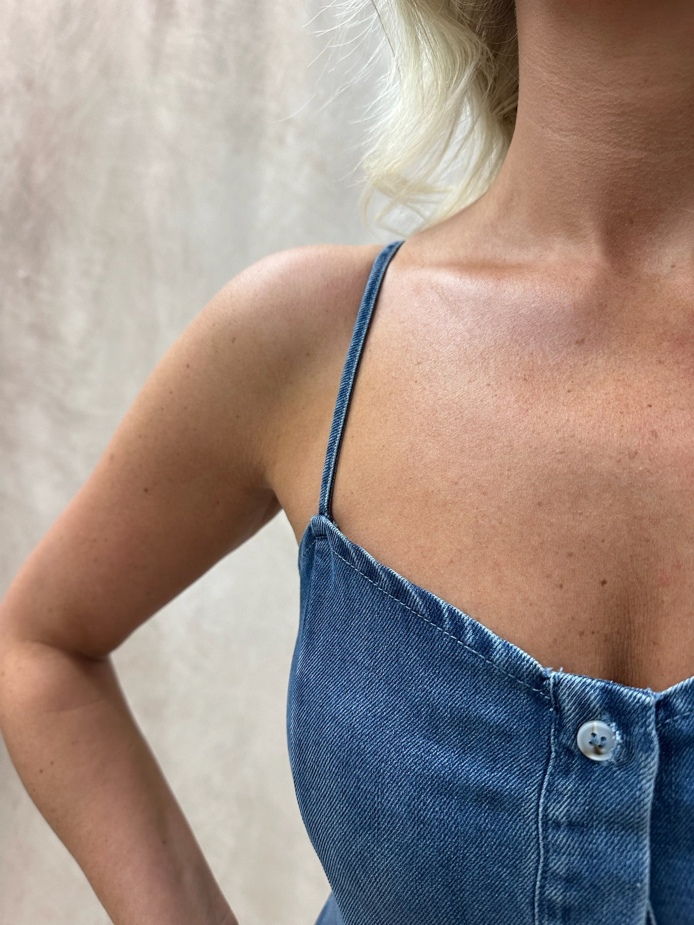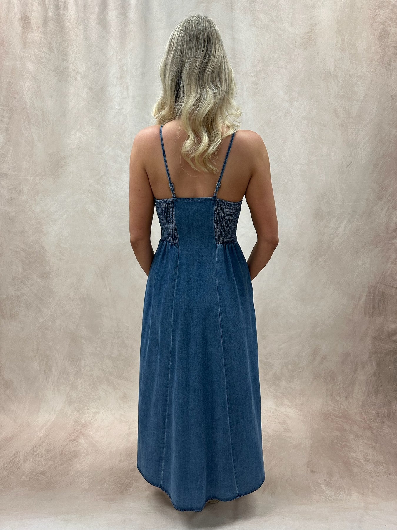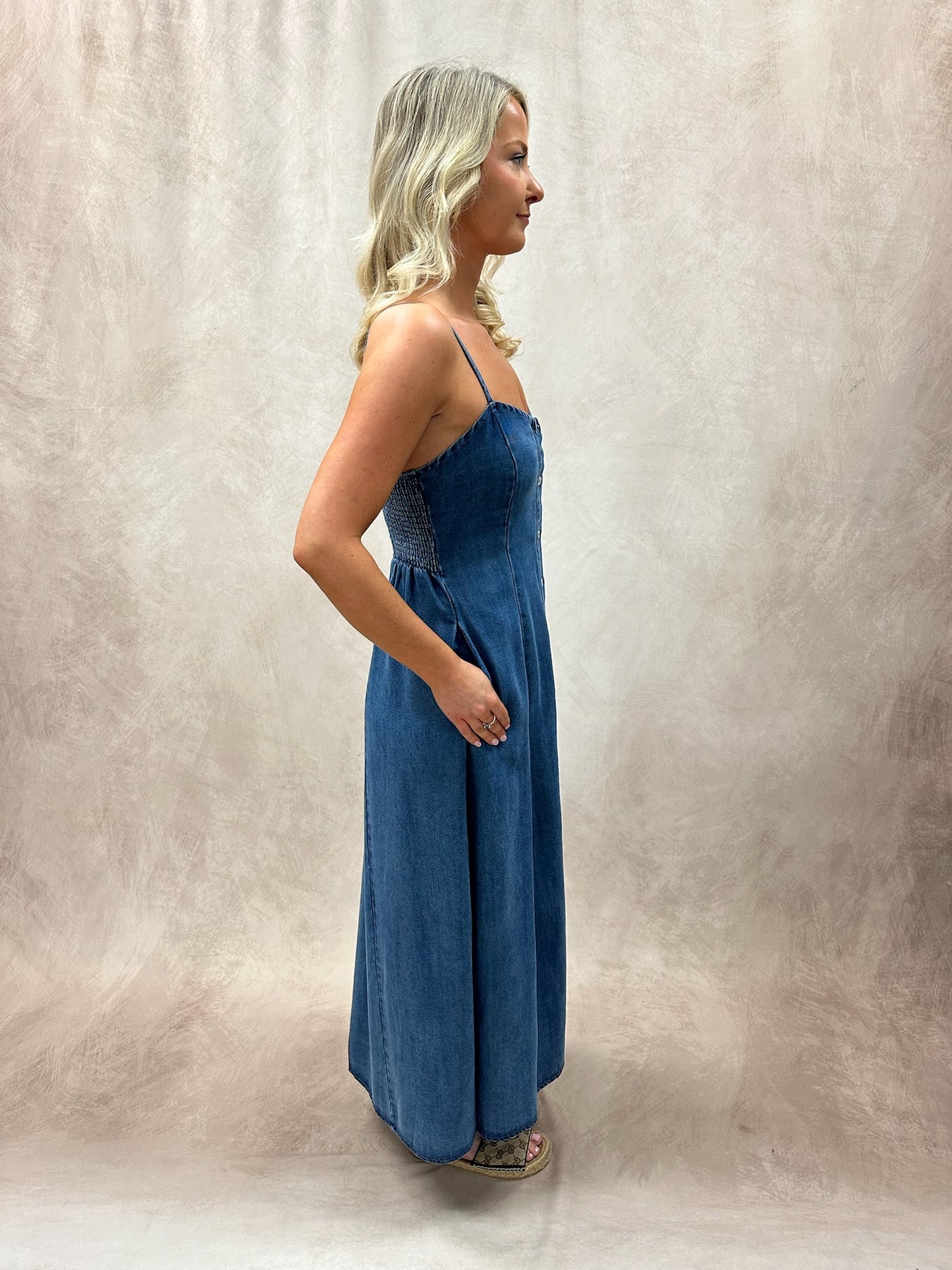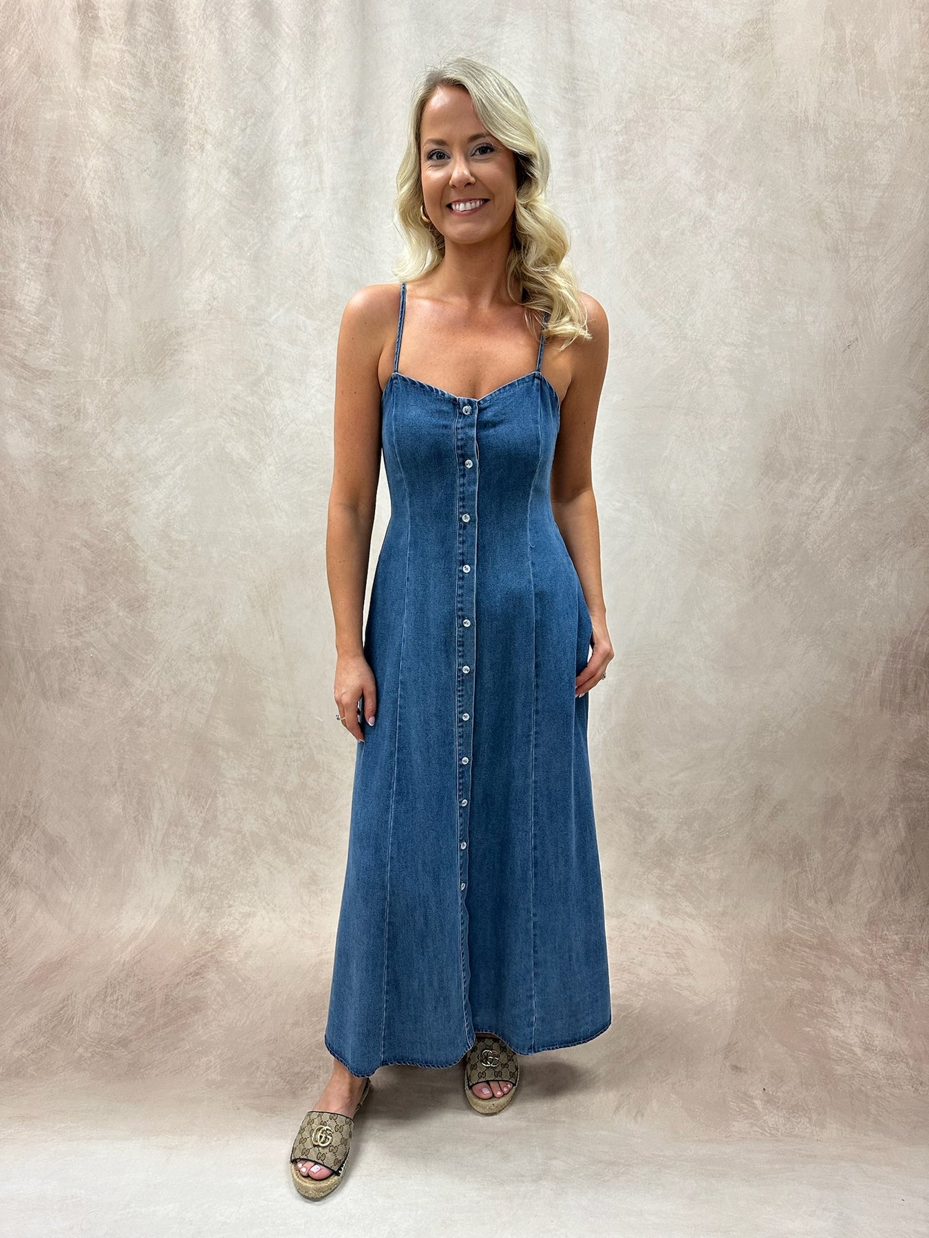 A button-down denim midi dress is the perfect blend of timeless structure and everyday ease. Crafted from classic denim, it features a full front button closure that adds versatility and a touch of vintage charm. The midi length offers a flattering, wear-anywhere silhouette, while tailored seams or a relaxed fit keep it effortlessly stylish. Durable yet comfortable, it’s a go-to piece that works across seasons and occasions. Cinch the waist with a belt to define your shape, then pair with ankle boots or clean white sneakers for an easy daytime look. Layer with a lightweight cardigan or structured blazer to dress it up, and finish with simple gold accessories for a polished touch.