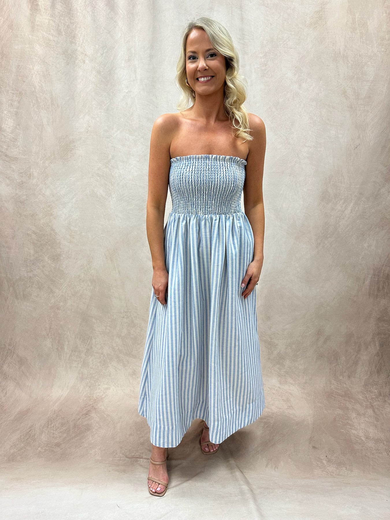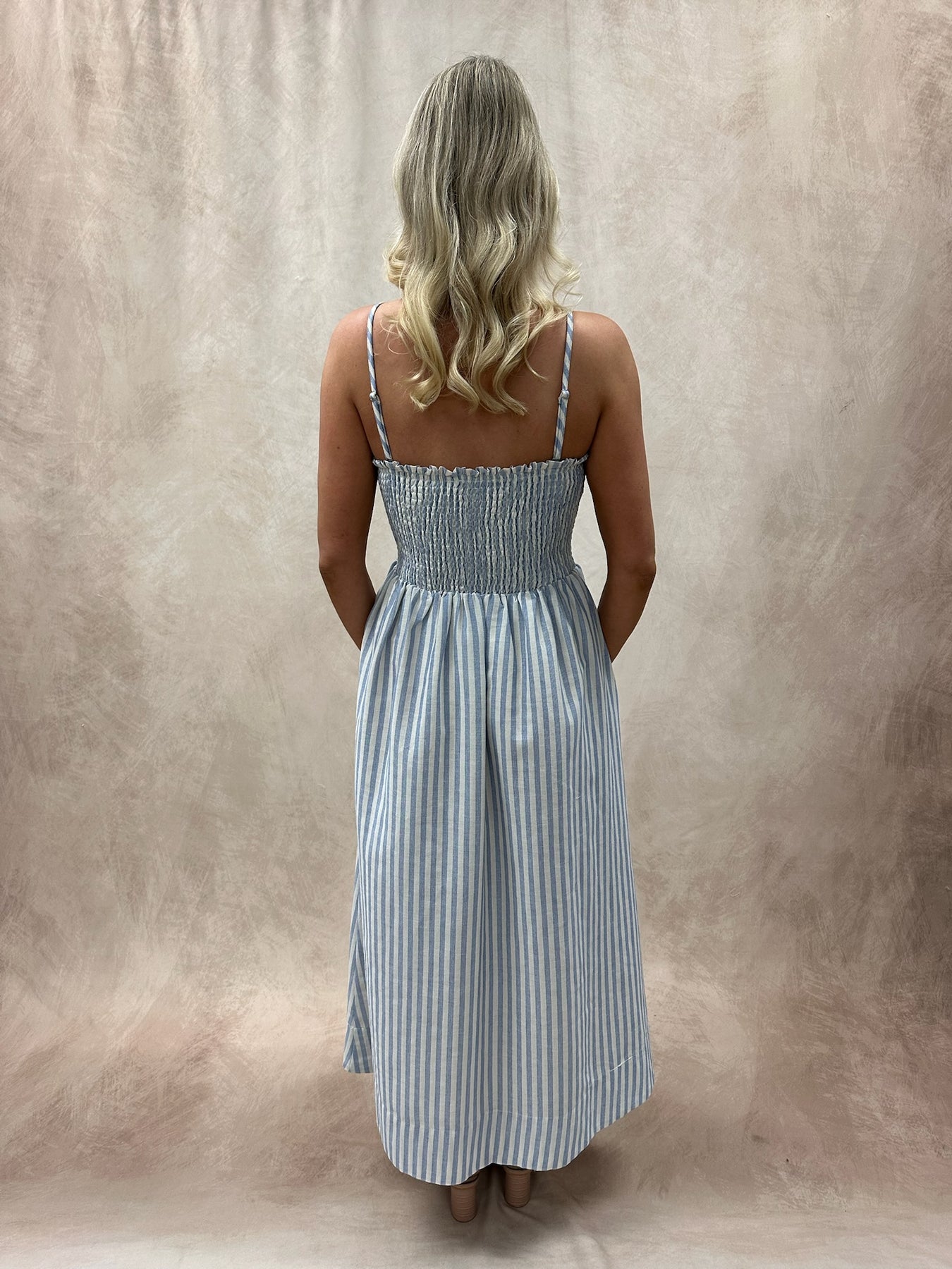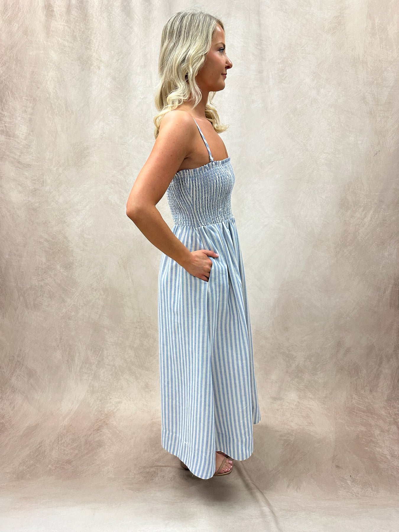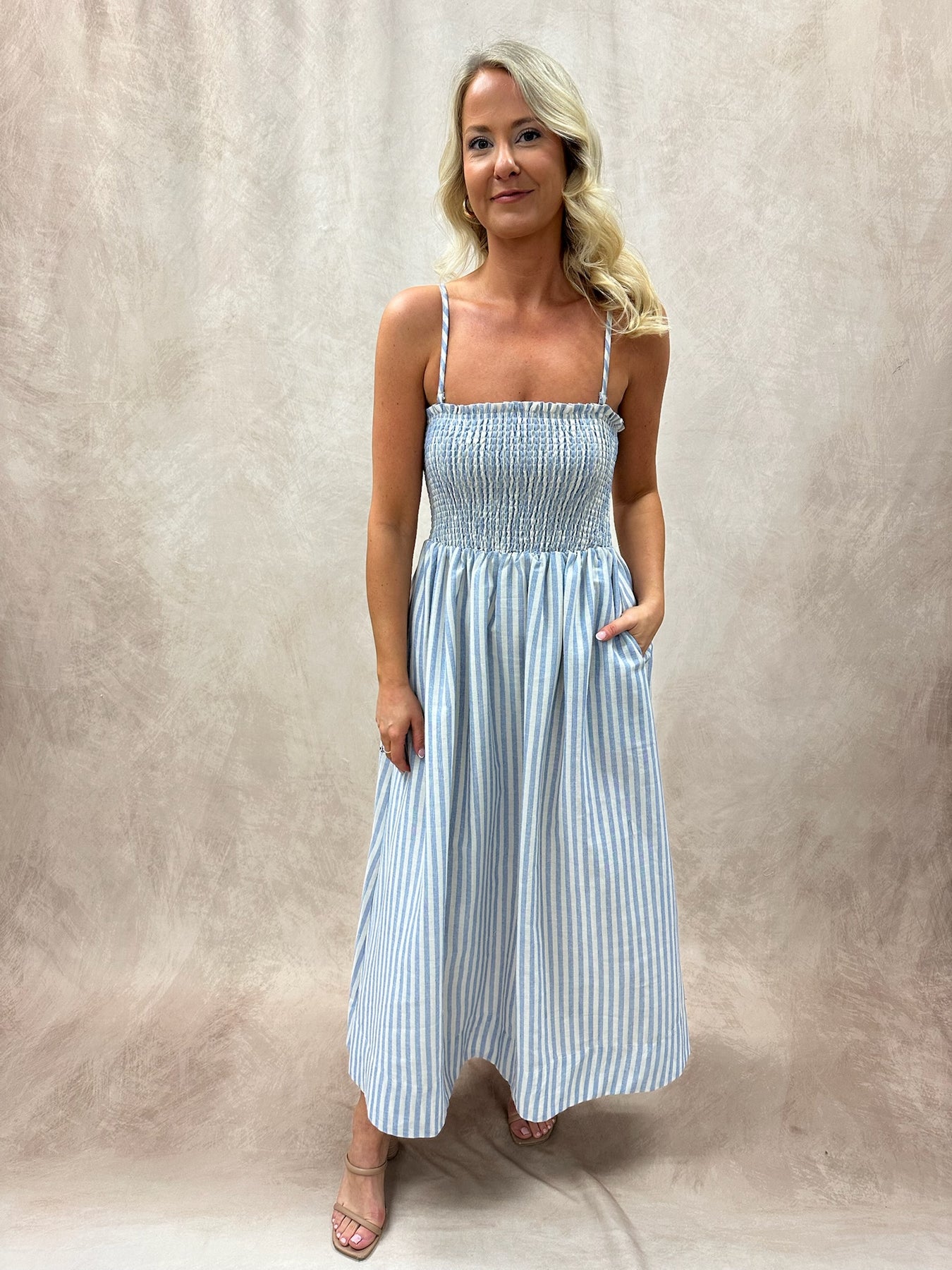 Timelessly chic, this blue striped maxi dress with a smocked top is a fresh take on classic summer style. The smocked bodice offers a flattering, fitted shape, while the flowing skirt creates graceful movement with every step. The soft blue stripes add subtle pattern and texture, making it perfect for relaxed weekends or sunny daytime outings. Pair it with flat sandals and a woven tote for an easy, casual look, or elevate it with heeled espadrilles and delicate jewelry for a polished, warm-weather outfit. This dress combines comfort and style, making it a go-to piece for effortless, all-day wear.