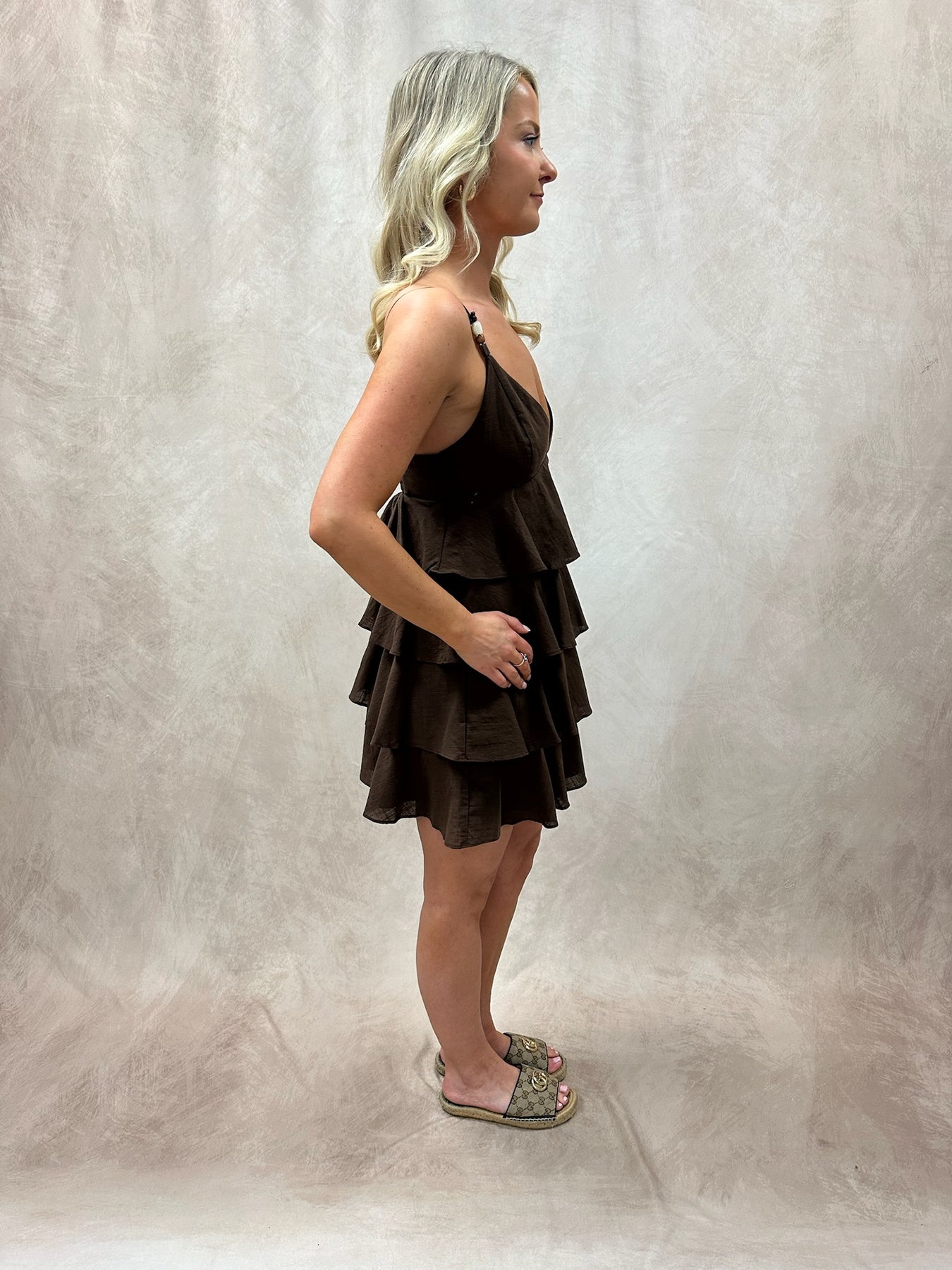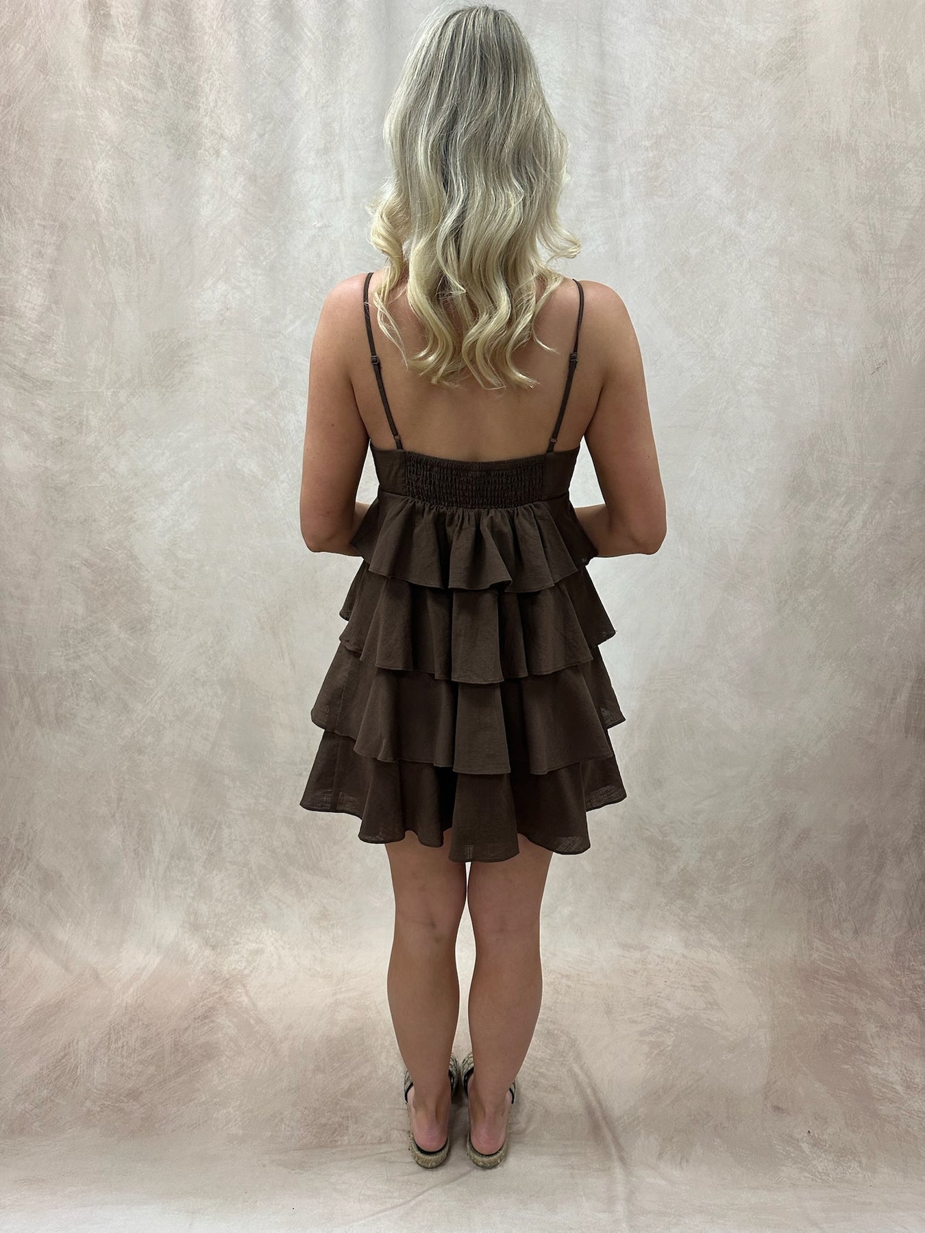 A brown ruffled tiered mini dress brings playful movement and earthy charm to your wardrobe. Designed with soft, cascading tiers and delicate ruffle details, it creates a flirty, feminine silhouette that’s full of texture and flow. The rich brown tone adds warmth and versatility, making it easy to style across seasons while still standing out in a subtle, sophisticated way. Pair it with knee-high boots or ankle booties for an effortlessly chic look, or keep it light with strappy sandals in warmer weather. Add gold or bronze accessories to complement the warm tones, and throw on a cropped jacket for an extra layer of style.